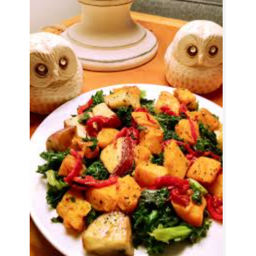 Brioche toast, home-made hummus, pickled roasted maitake mushrooms, fresh kale, kale chips, feta, cherry tomatoes